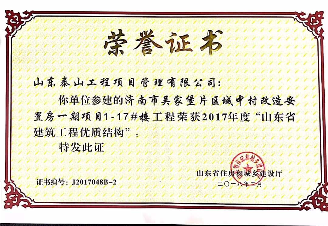 質(zhì)量是企業(yè)的生命。在山東省住房和城鄉(xiāng)建設(shè)廳組織的2017年度“山東省建筑工程優(yōu)質(zhì)結(jié)構(gòu)”評審中,吳家堡片區(qū)安置房一期工程1#到17#樓(共計17棟樓),憑借過硬的質(zhì)量、完善的管理順利通過專家考評,喜獲“山東省建筑工程優(yōu)質(zhì)結(jié)構(gòu)”。“山東省建筑工程優(yōu)質(zhì)結(jié)構(gòu)”代表著全省各建筑企業(yè)施工質(zhì)量管理的領(lǐng)先水平,為沖刺山東省建筑工程質(zhì)量最高榮譽“泰山杯”奠定了基礎(chǔ)。