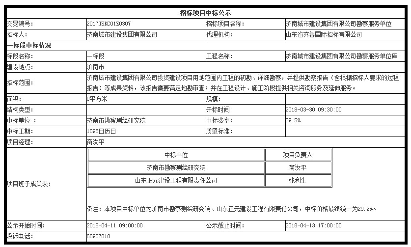 濟南城市建設集團有限公司勘察服務單位中標公示
