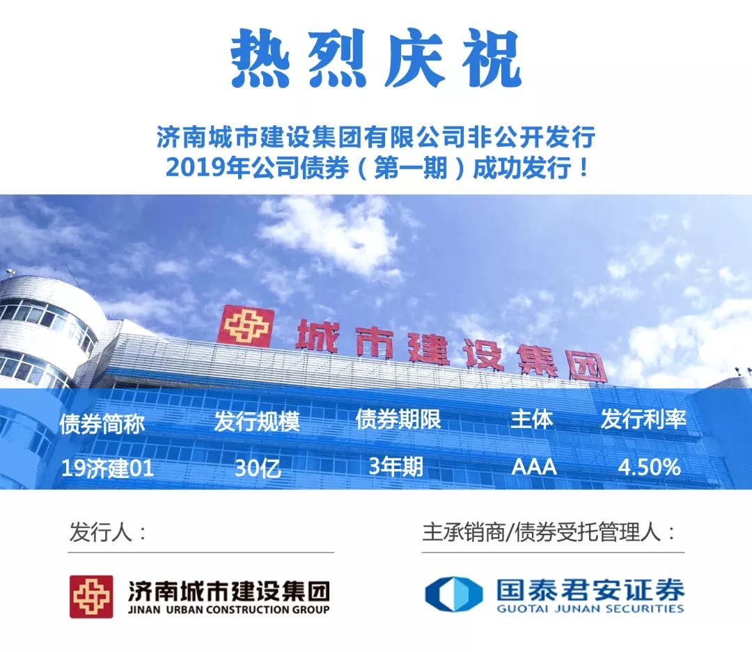 4月12日,濟南城市建設集團非公開發行2019年公司債券(第一期)成功發行。濟南城市建設集團公開市場首期債券在當天完成簿記,并發布3月社會融資規模、進出口數據超預期回暖的不利市場情緒中,成功發行30億元,債券期限為3年期,發行利率為4.5%(低于3年期貸款基準利率4.75%)。