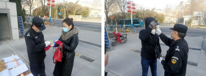 金宇公司物業分公司通過在門口設置體溫測量點,嚴格落實小區入口登記和體溫監測制度。安保人員在門口24小時值守,進入園區需持疫情期間臨時通行證,嚴格執行“三不準”:不戴口罩者一律不準進入辦公區;不接受體溫量測者一律不準進入辦公區;測量體溫高于37.3℃(含)者一律不準進入辦公區。