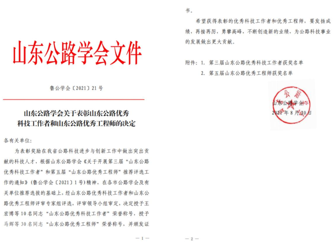 近日,山東公路學(xué)會發(fā)布了《關(guān)于表彰山東公路優(yōu)秀科技工作者和山東公路優(yōu)秀工程師的決定》(魯公學(xué)會〔2021〕21 號)文件,金宇公司李玉寶同志榮獲“山東公路優(yōu)秀科技工作者”榮譽(yù)稱號,張加華同志榮獲“山東公路優(yōu)秀工程師”榮譽(yù)稱號。