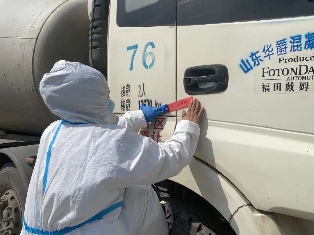 目前的建設階段,施工現(xiàn)場必須有鋼筋、混凝土的持續(xù)供應。工地設置了材料進場專用過渡區(qū),對材料進行防疫消殺后才能進入現(xiàn)場使用。在封閉區(qū)門口,記者看到,兩輛混凝土攪拌車正準備進入現(xiàn)場作業(yè)。管理人員在進行必要的信息查驗登記后,在車門貼上封條,對車體消殺之后,攪拌車順利進入了現(xiàn)場施工。宋丹生介紹,貼封條、禁止司機下車,可最大限度避免施工人員與外界的接觸。