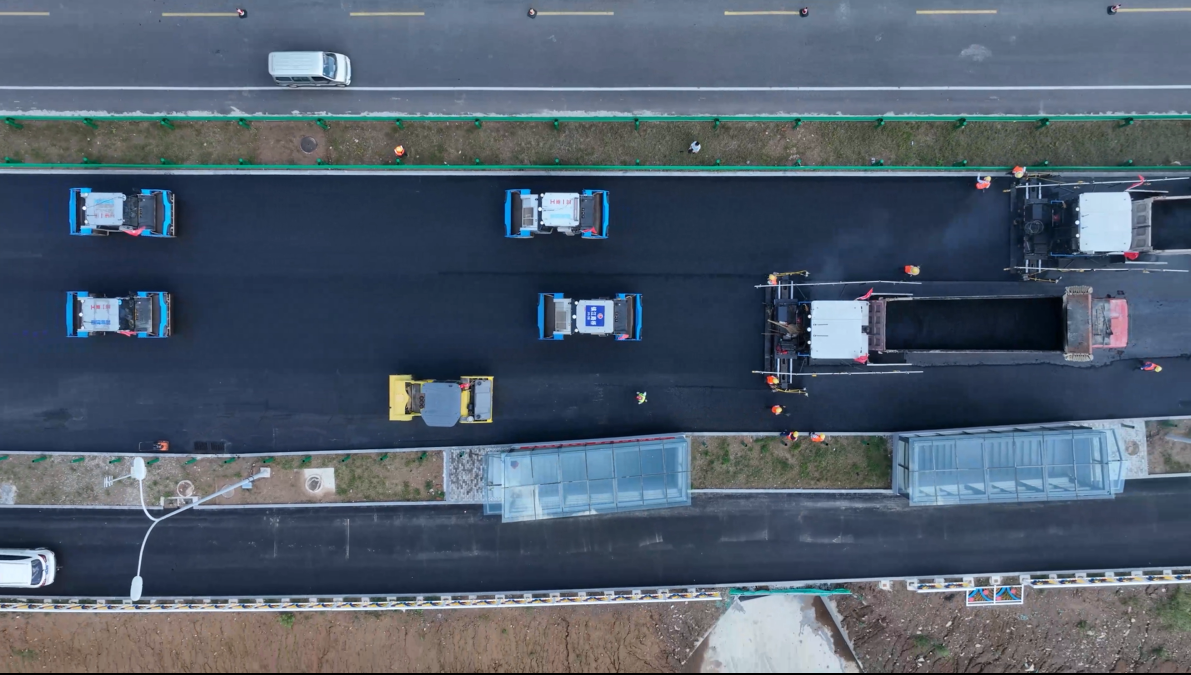 在現(xiàn)場(chǎng),無人駕駛的2臺(tái)SSP90C-8攤鋪機(jī)和5臺(tái)STR130C-8雙鋼輪壓路機(jī)組成智能無人化機(jī)群,按預(yù)設(shè)好的攤鋪速度、運(yùn)行軌跡、碾壓速度與遍數(shù)、搭接寬度等指標(biāo)相互配合,進(jìn)行瀝青攤壓作業(yè)。借助北斗定位系統(tǒng)、高速通信系統(tǒng)、避障感知系統(tǒng)等智能技術(shù),工程師在移動(dòng)控制室實(shí)時(shí)監(jiān)控工作數(shù)據(jù),并按控制算法針對(duì)現(xiàn)場(chǎng)高精度傳感結(jié)果,動(dòng)態(tài)調(diào)整施工參數(shù)。