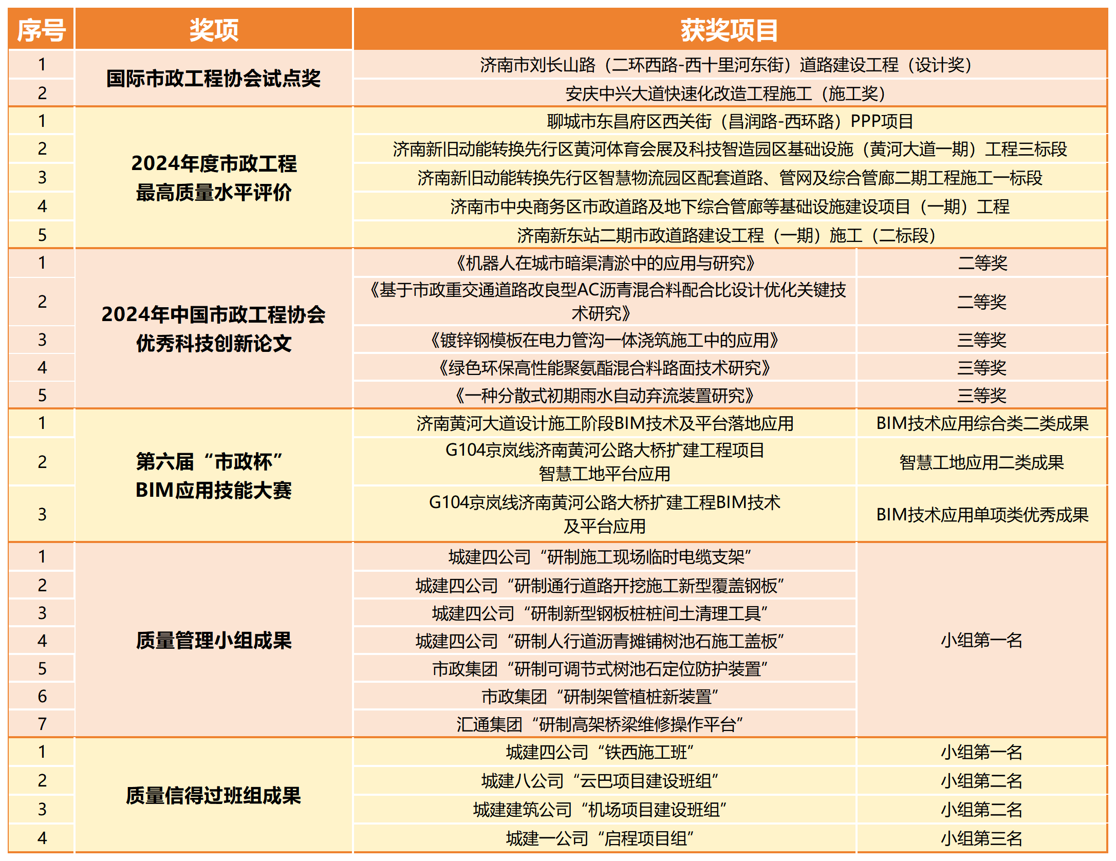 其中,濟南市劉長山路(二環(huán)西路-西十里河東街)道路建設工程等2項工程獲評“國際市政工程協(xié)會試點獎”;聊城市東昌府區(qū)西關街(昌潤路-西環(huán)路)PPP項目等5項工程獲評“2024年度市政工程最高質量水平評價”;《機器人在城市暗渠清淤中的應用與研究》等5篇論文獲評“中國市政工程協(xié)會科技創(chuàng)新論文”并入選《中國市政工程協(xié)會科技創(chuàng)新論文集》;城建集團公司3項成果獲評第六屆“市政杯”BIM應用技能大賽獎項,其中包括1項BIM技術應用綜合類二類成果、1項智慧工地應用二類成果、1項BIM技術應用單項類優(yōu)秀成果;“研制施工現(xiàn)場臨時電纜支架”等7項質量管理小組成果獲評小組一等獎第一名;“云巴項目建設班組”等4項班組成果獲評全國市政工程“質量信得過班組”示范級班組前三名。