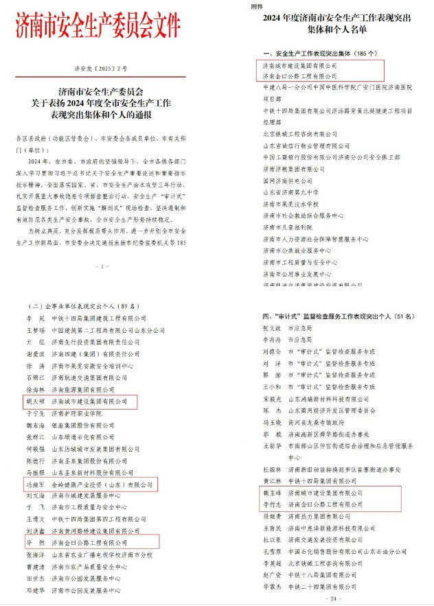 近日,濟南市安全生產委員會印發《關于表揚2024年度全市安全生產工作表現突出集體和個人的通報》,濟南城市建設集團及集團所屬山東金曰交通發展集團被評為安全生產工作表現突出集體,3名同志被評為安全生產工作表現突出個人,2名同志被評為“審計式”監督檢查服務工作表現突出個人。